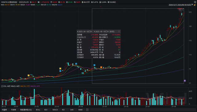 仅过去四个月,胜宏科技的市值便猛增超千亿元,在资本市场赚足眼球。数据显示,4月18日至8月18日,公司股价从77.75元升至231.77元,涨跌幅为216.48%。