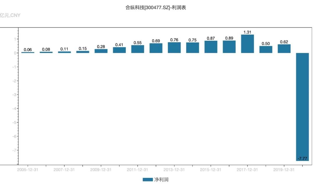 2017年也是合纵科技上市以来利润的最高点。这一年,合纵科技的净利润达到1.31亿的最高值后,便开始快速下滑,2020年更是降至-7.77亿,比刚上市时下降了991%。
