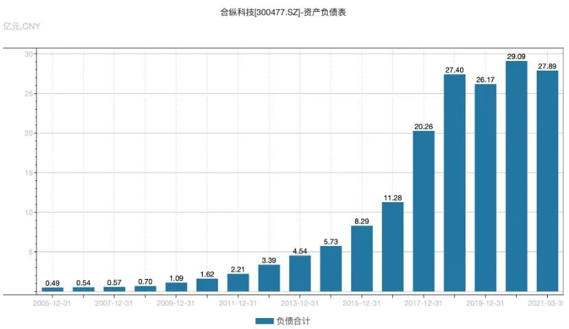 债务方面,2015年—2017年,合纵科技负债合计由8.29亿增至20.26亿,此后至今,合纵科技的负债合计维持在26亿—29亿之间。2020年,资产负债率增至70.06%的峰值。高于行业平均水平。