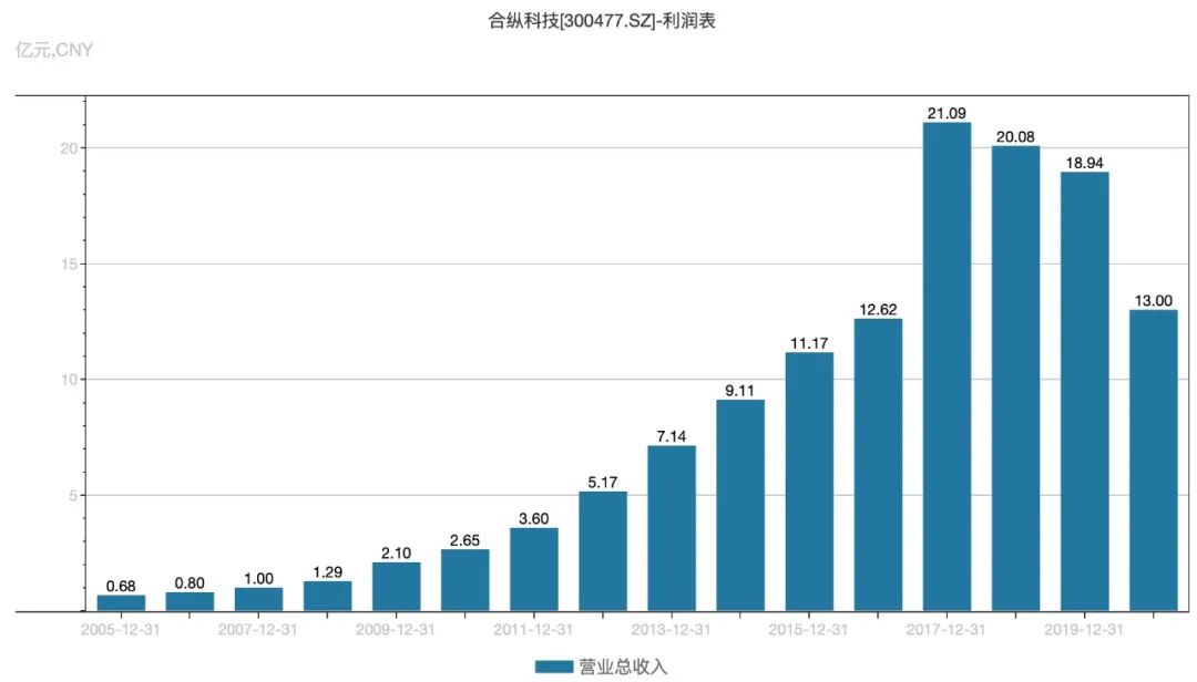 2015—2020年,上市的4年间,合纵科技营业总收入从11.17亿元至13亿元,增长了16.38%。其中,2017年是合纵科技营收的巅峰,为21.09亿元,此后便开始逐年下滑。