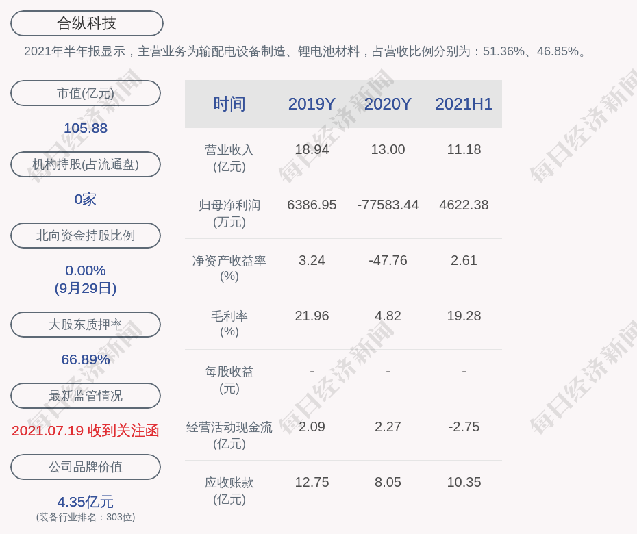 2021年半年报显示,合纵科技的主营业务为输配电设备制造、锂电池材料,占营收比例分别为:51.36%、46.85%。