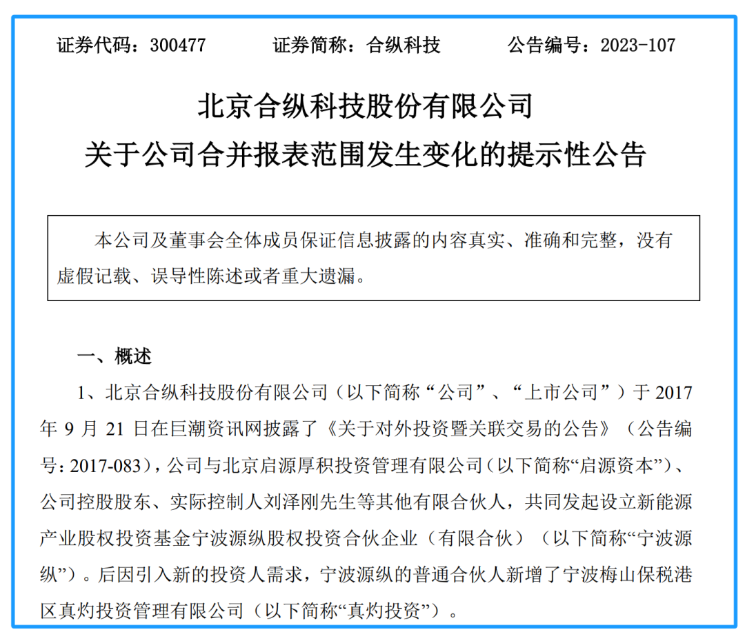 宁波源纵的普通合伙人原为启源资本以及宁波梅山保税港区真灼投资管理有限公司(以下简称“真灼投资”),两者的出资均为1万元。据合纵科技披露,因自身原因,上述两家公司于近日将其各自持有的宁波源纵1万元的(普通合伙人)出资份额转让给了广西合纵桂宁电力工程有限公司(下称“桂宁电力”),转让金额合计2万元。