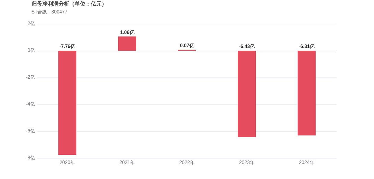 利润角度分析,2020年ST合纵实现归母净利润-7.76亿元,2024年-6.31亿元。亏损幅度虽有所收窄,但仍处于持续亏损状态。