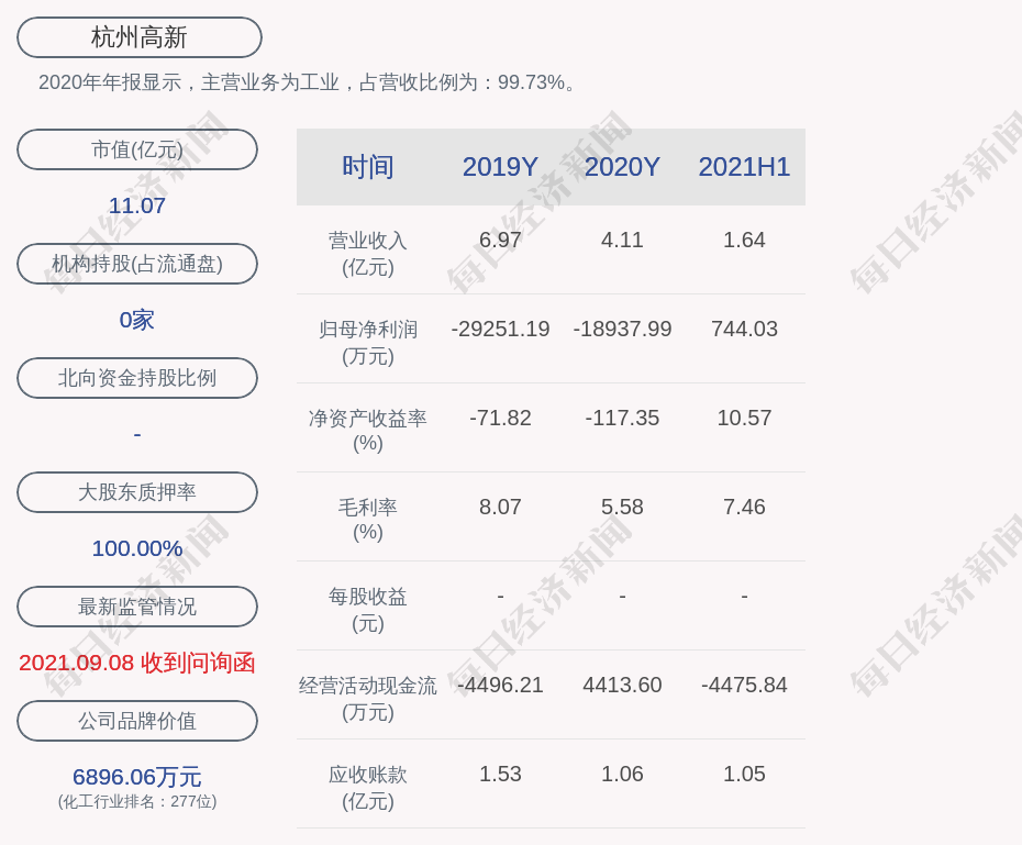 2020年年报显示,杭州高新的主营业务为工业,占营收比例为:99.73%。