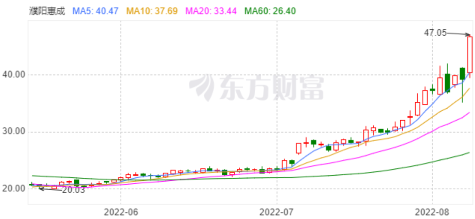 8月8日,濮阳惠成股价单日拉涨19%至46.66元/股,创上市以来股价最高纪录。