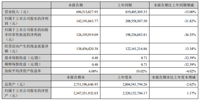 公司实现营业收入69651.38万元,较上年同期下降15%;实现归属于上市公司股东的净利润14219.1万元,较上年同期下降31.82%。顺酐酸酐衍生物营业收入49907.29万元,同比下降21.44%。