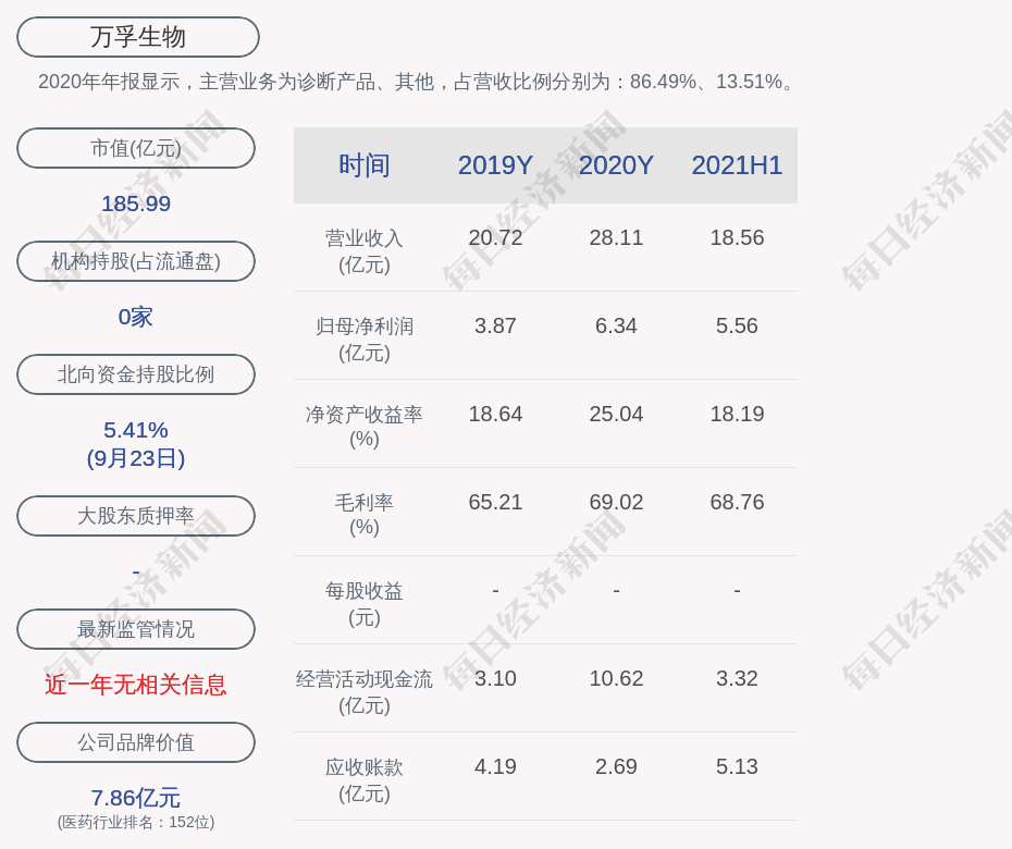 2020年年报显示,万孚生物的主营业务为诊断产品、其他,占营收比例分别为:86.49%、13.51%。