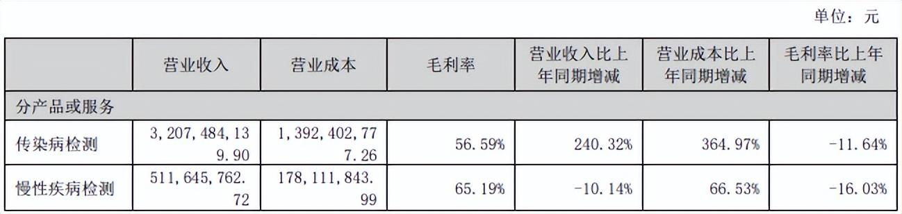据2022年中报显示,万孚生物主营业务收入为40.34亿元。其中,传染病检测业务收入32.07亿元,同比大幅增长240.32%,营收占比约79.5%,是公司的主要收入来源;慢性疾病检测业务收入5.12亿元,同比减少10.14%。但同时,公司营业成本大幅增长,导致主营业务毛利率出现不同程度下滑;其中,传染病检测业务毛利率同比大幅减少11.64个百分点,慢性疾病检测业务毛利率同比大幅减少16.03个百分点。