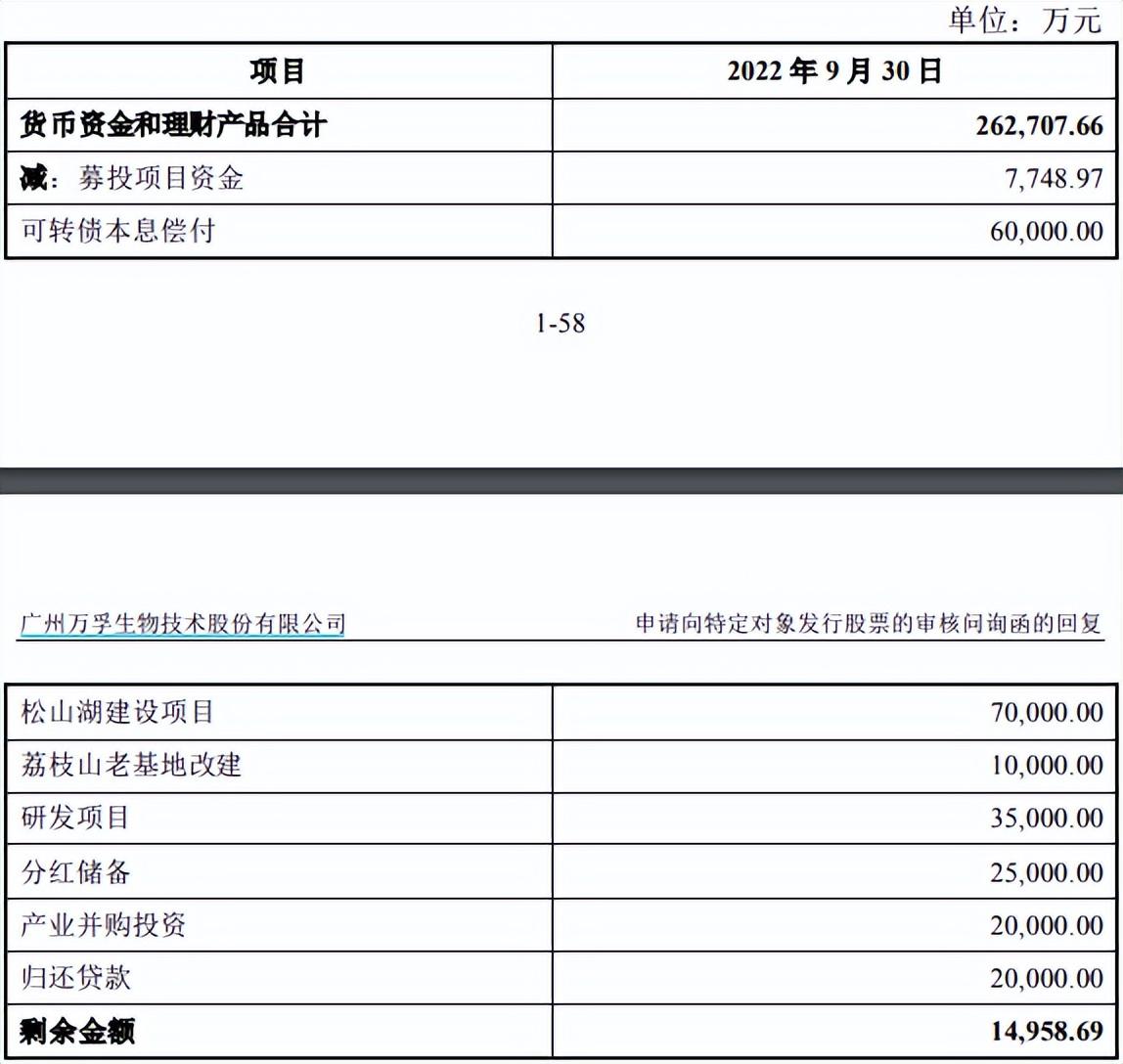 对此,万孚生物先后于11月8日、12月30日均回应称,截至2022 年 9 月 30 日,发行人货币资金和银行理财产品共有262707.66万元,大部分资金均有明确规划用途。值得注意的是,明确规划用途中包括2.5亿元的分红储备。