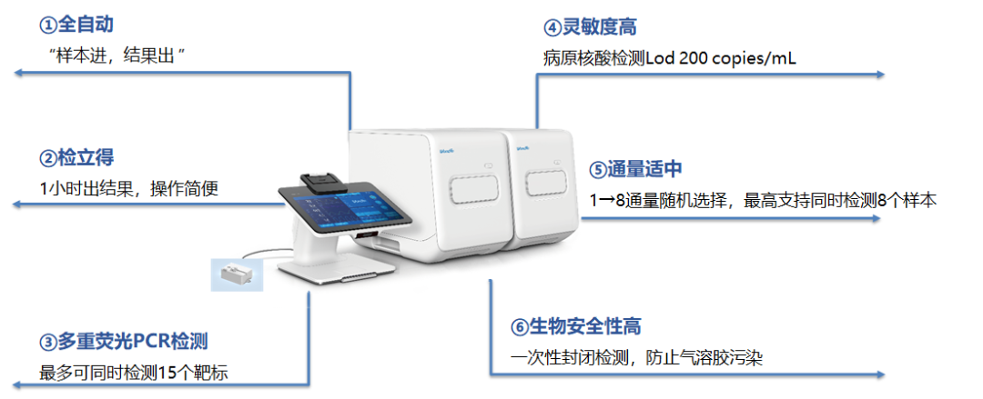 搭配试剂卡盒,只需一步加样,即可实现自动化核酸提取、多重PCR扩增、结果分析等全部实验过程,1小时内可自动出具结果并打印报告,真正实现“样本进,结果出”的核酸POCT理念。