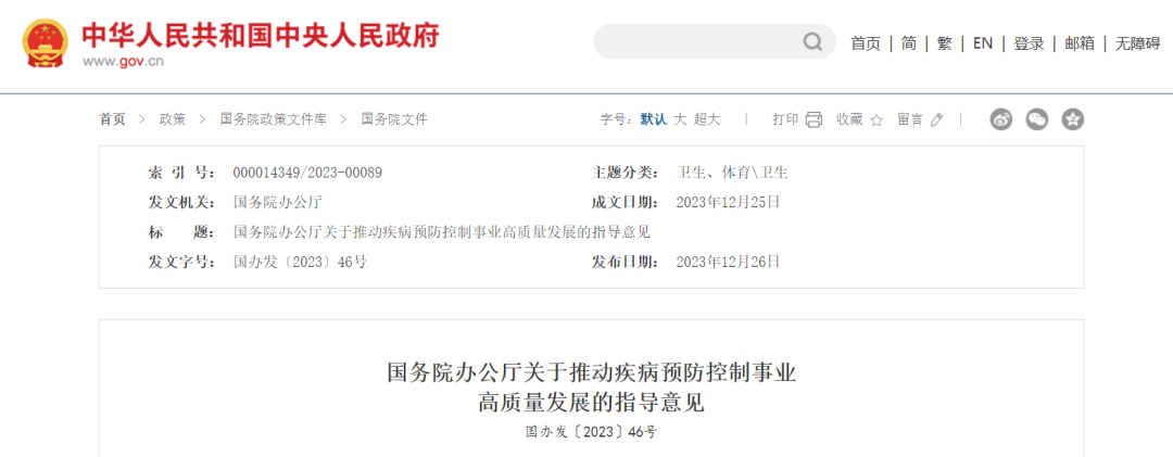 2023年12月26日,国务院办公厅发布《关于推动疾病预防控制事业高质量发展的指导意见》(国办发〔2023〕46号),指出疾病预防控制体系是保护人民健康、保障公共卫生安全、维护经济社会稳定的重要保障,要求整体谋划疾控事业发展、系统重塑疾控体系、全面提升疾控能力,明确提升监测预警和检验检测能力。