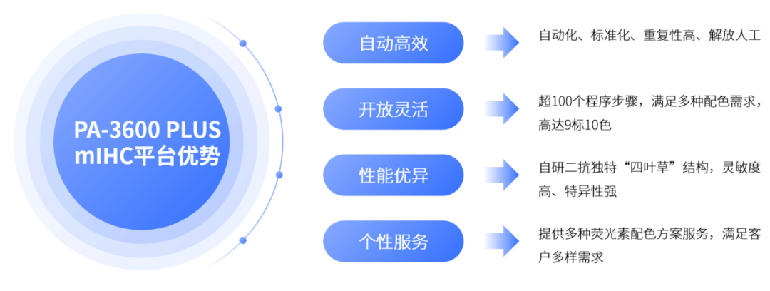 PA-3600 PLUS拓展性更强,各种染色项目灵活转换,基于自研二抗优异性能,可实现同一平台IHC、ICC、ISH、mIHC多领域应用。并针对mIHC可设置100步染色,解决mIHC手工繁琐的操作,可满足9标10色的染色需求。