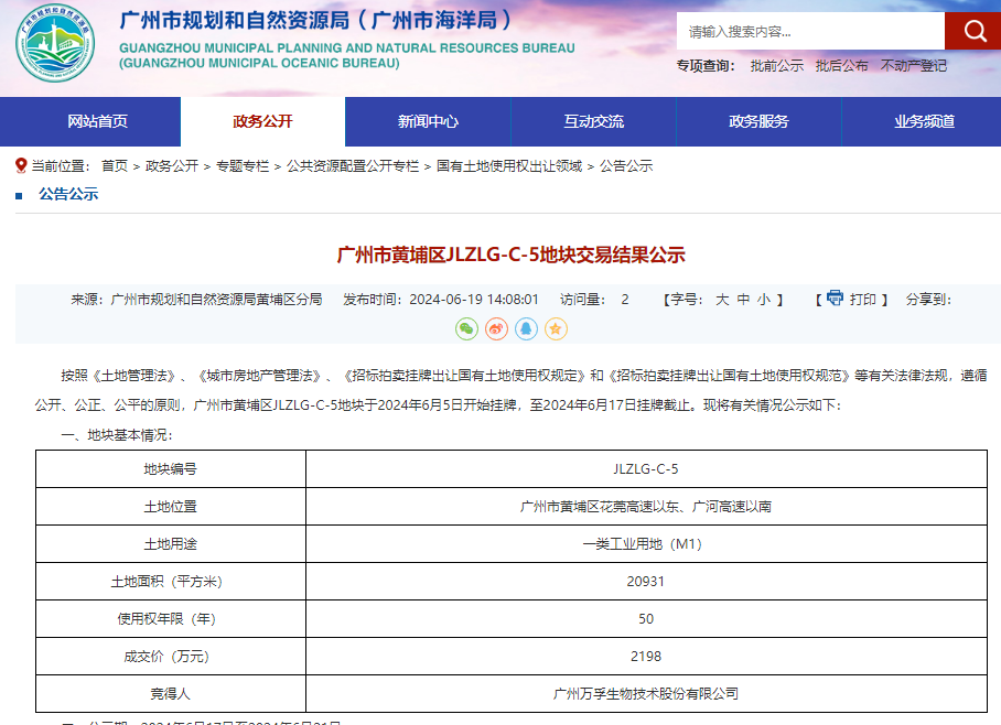 乐居财经王敏 6月19日,广州市黄埔区JLZLG-C-5地块交易结果公示显示,广州万孚生物技术股份有限公司(以下简称“万孚生物”)竞得广州市黄埔区JLZLG-C-5地块,成交价为2198万元。