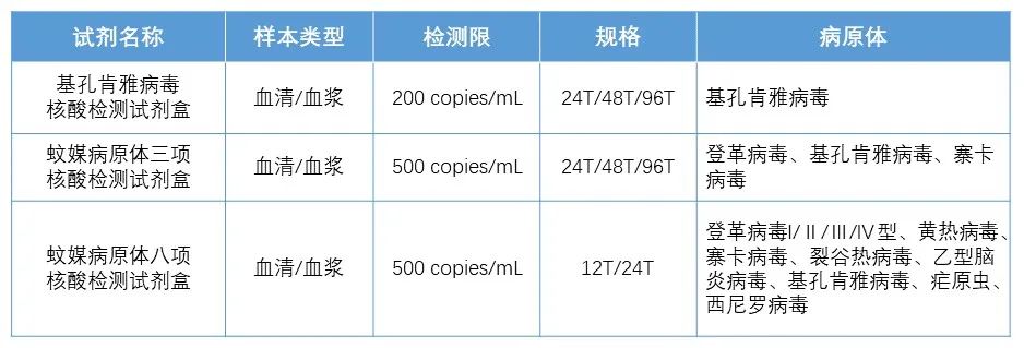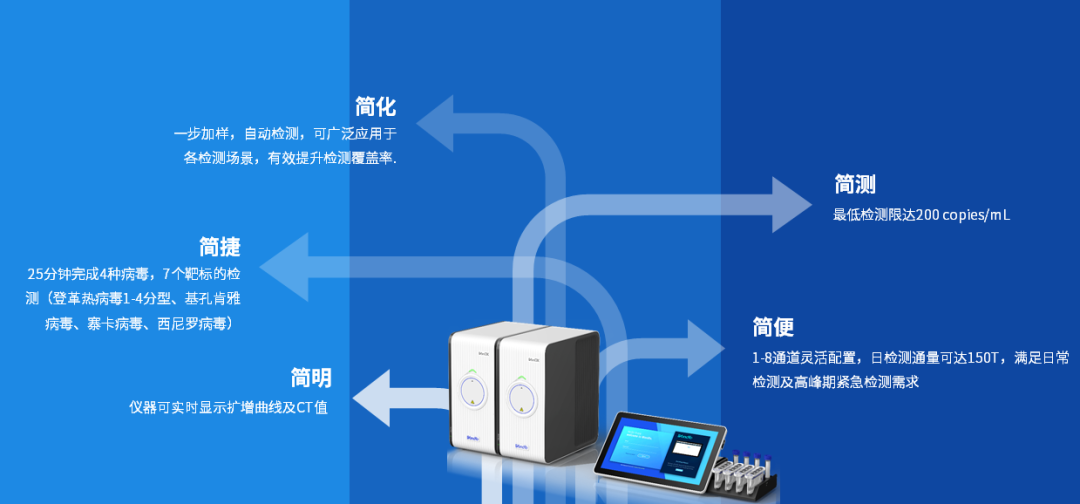 25分钟完成4种病毒、7个靶标的检测:登革病毒1-4分型、基孔肯雅病毒、寨卡病毒、西尼罗病毒;