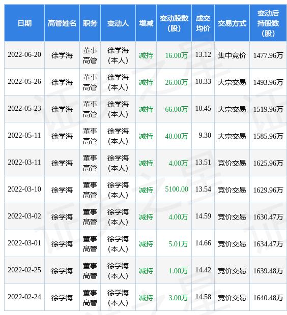 根据6月21日市场公开信息、上市公司公告及交易所披露数据整理,蓝海华腾(300484)最新董监高及相关人员股份变动情况:2022年6月20日公司董事,高管徐学海共减持公司股份16.0万股,占公司总股本为0.0769%。变动期间公司股价上涨4.1%,6月20日当日收盘报13.2元。