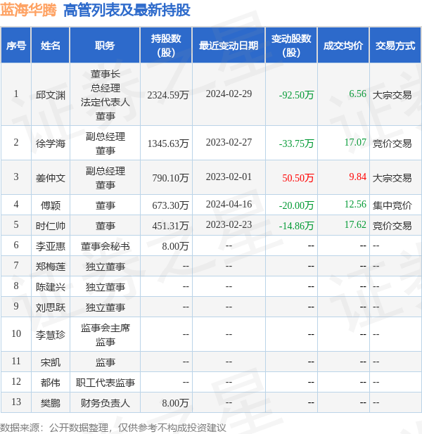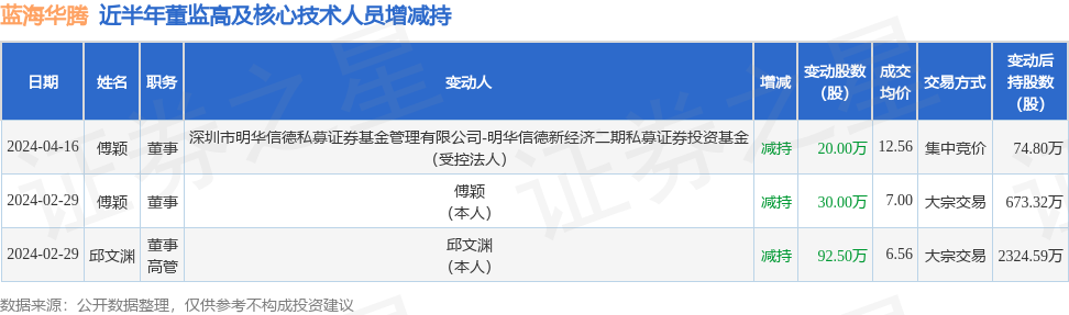 蓝海华腾近半年内的董监高及核心技术人员增减持详情如下: