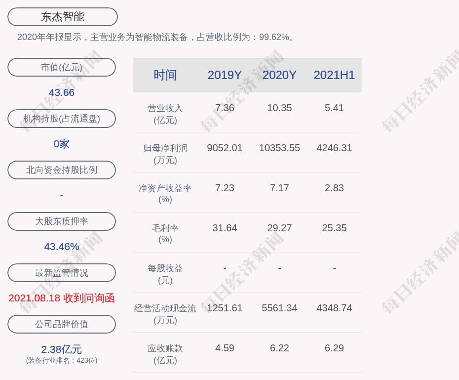 2020年年报显示,东杰智能的主营业务为智能物流装备,占营收比例为:99.62%。