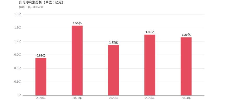 利润角度分析,2020年恒锋工具实现归母净利润0.83亿元,2024年1.29亿元。期间利润表现呈现明显的周期性波动特征。