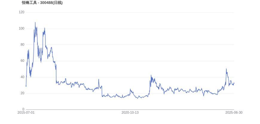 从上市首日至今,恒锋工具的市值实现了2.12倍的增长,显示出资本市场对公司发展的认可。2025年2月26日,恒锋工具的市值巅峰达到96.04亿元,股价也顺应升至56.07元。而至6月30日收盘,恒锋工具的股价为32.62元,市值为56.48亿元,相比峰值时期市值减少39.57亿元,市值蒸发了41.20%。