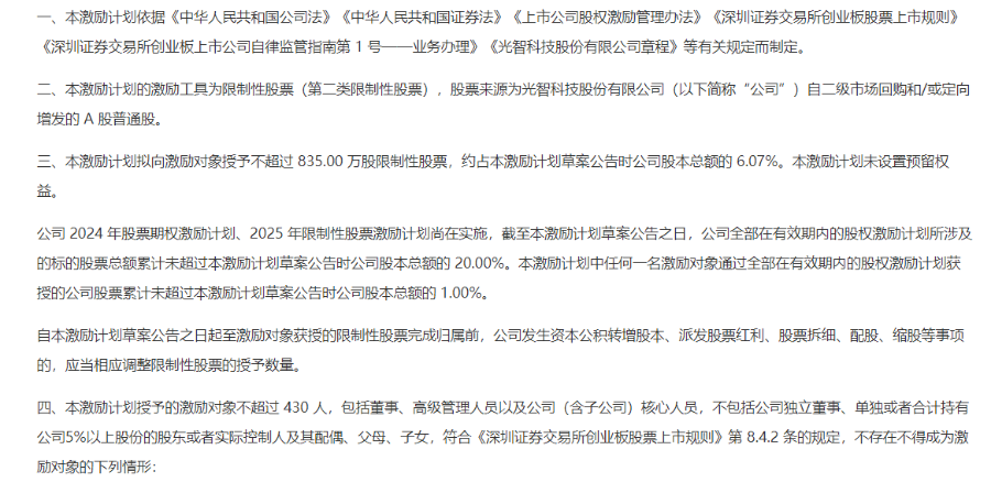 然而,上述定增融资最终均已失败告终。此后,光智科技推出了激励计划。2025年11月,光智科技推出股权激励计划,拟通过定向发行股票以及提取激励基金买入流通股的方式,向包括董监高在内的不超过430名员工授予股票,行权价格为21.02元/股。