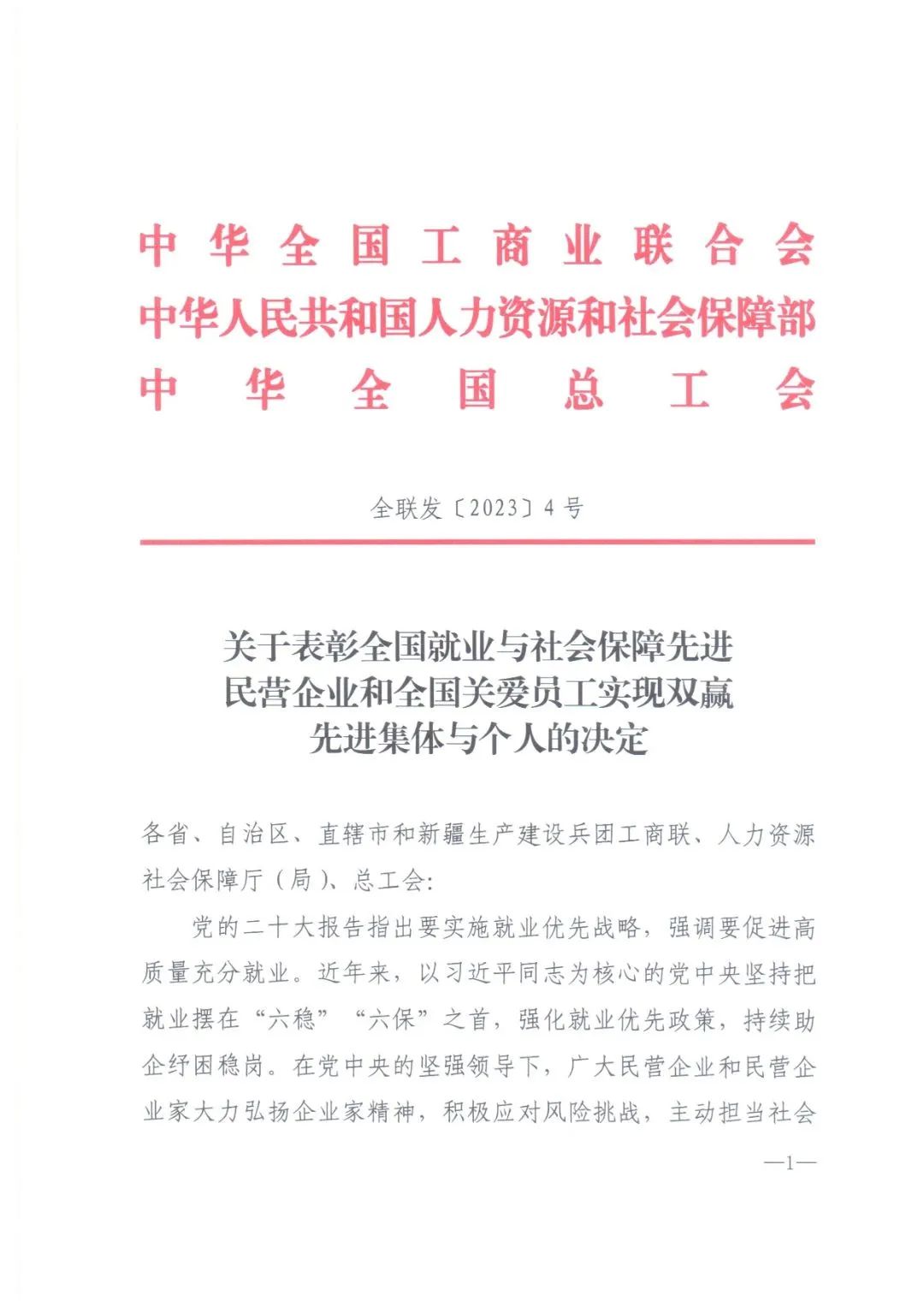 近日,全国工商业联合会、人力资源和社会保障部、全国总工会联合发布“全国就业与社会保障先进民营企业和全国关爱员工实现双赢先进集体与个人”表彰名单,华自科技荣获“全国就业与社会保障先进民营企业”称号。