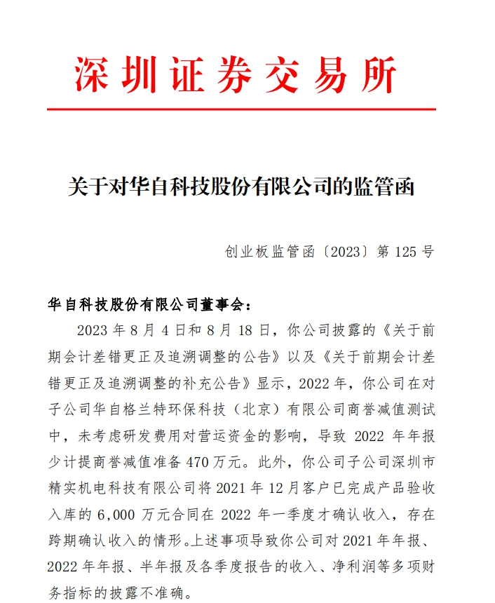 因多期财报不准确,华自科技27日收到深交所下发的监管函。