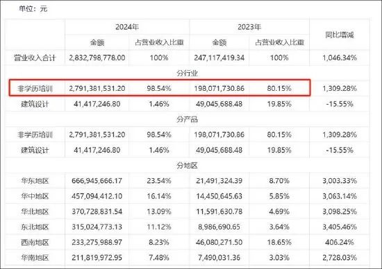 至此,华图教育成为上市公司营收基本盘。2024年教育培训业务收入占比高达98%。24年业绩大增,公司2024年实现营业收入28.32亿元,同比增加1046.34%,净利润5299万元,同比增加157.62%,扣非净利润2444万元,同比增加123.09%。