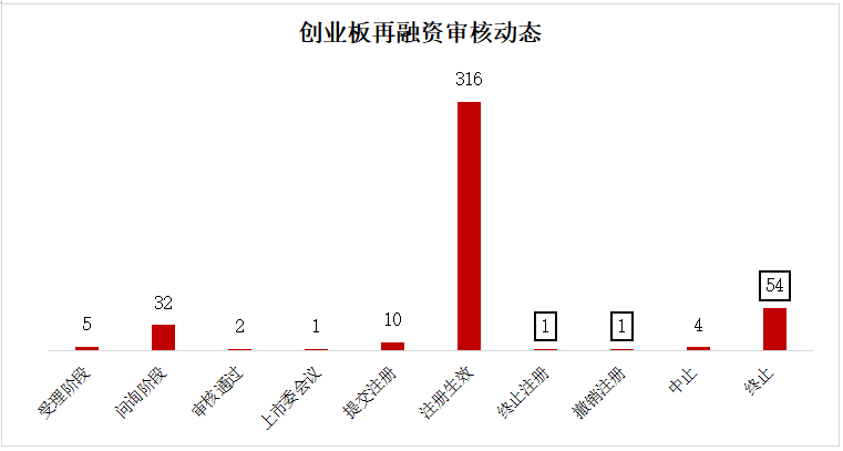 再融资方面,目前处于受理阶段有5家,问询阶段的有32家,审核通过2家,上市委会议通过1家,提交注册10家,注册生效316家,撤销注册1家,终止注册1家,中止4家,终止(撤回)54家,合计426家。