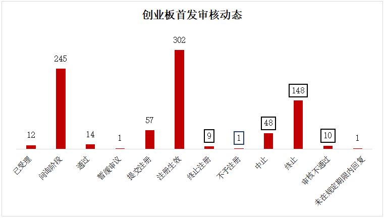 深交所信息显示,截止2月18日下午4时,创业板累计受理了837家企业的首发申请。其中处于受理阶段的有12家,问询阶段的有245家,14家近期通过上市委会议,1家暂缓审议。过会企业中,57家提交注册中,302家注册生效,9家终止注册,1家不予注册,另有48家中止审核,148家终止(137家撤回材料)。