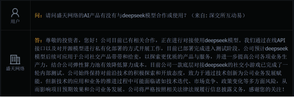 对此,盛天网络于2月5日在投资者互动平台回应称,公司目前正在进行对接使用Deepseek模型,预计该模型后续可应用于旗下社交产品带带电竞和给麦,以提高公司各项业务生产力。同时,盛天网络提到,公司一款底层对接DeepSeek的社交小游戏已完成了一轮内部测试。