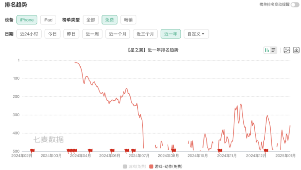 从排名情况来看,七麦数据显示,《星之翼》在上线当天拿到了国区iPhone设备游戏动作免费榜15名的成绩,但随后该游戏排名急剧下滑,未能维持其市场热度,目前排名已在300名之外。七麦数据预估《星之翼》在2024年国内iPhone设备收入仅为6.6万美元。
