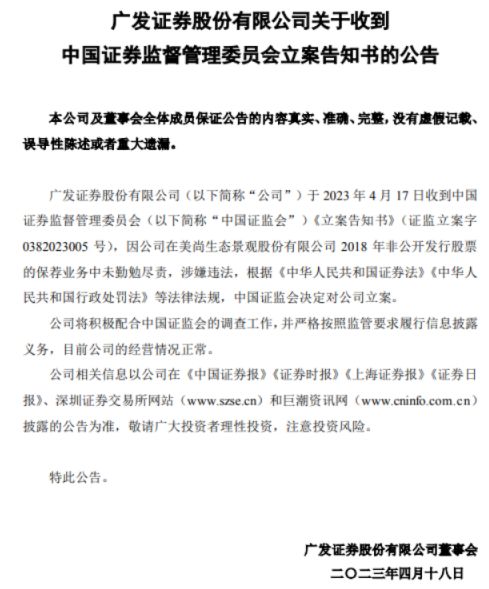 4月17日晚,广发证券公告,公司收到证监会《立案告知书》(证监立案字0382023005号)。
