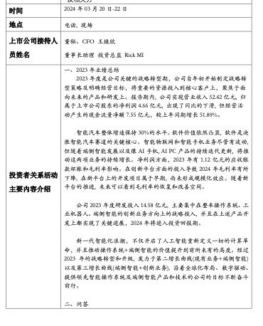 中科创达在说明会上进行了2023年业绩总结。2023年度是公司关键的战略转型期,公司自年初开始制定战略转型策略及明确经营目标,将重要的资源投入到核心客户上,聚焦于面向未来的产品和研发上。报告期内,公司实现营业收入52.42亿元,归属于上市公司股东的净利润4.66亿元,出现了同比的下滑,但经营活动产生的现金流量净额7.55亿元,较上年同期增长51.89%。