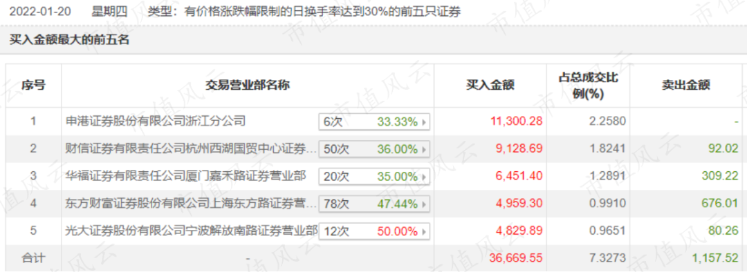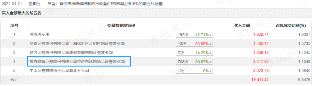 但也是5家营业部中的4家,在1月21日跌停当天割肉离场,只有东方财富上海东方路证券营业部未看到上榜信息。如果大佬还在里面,估计也腰斩了。