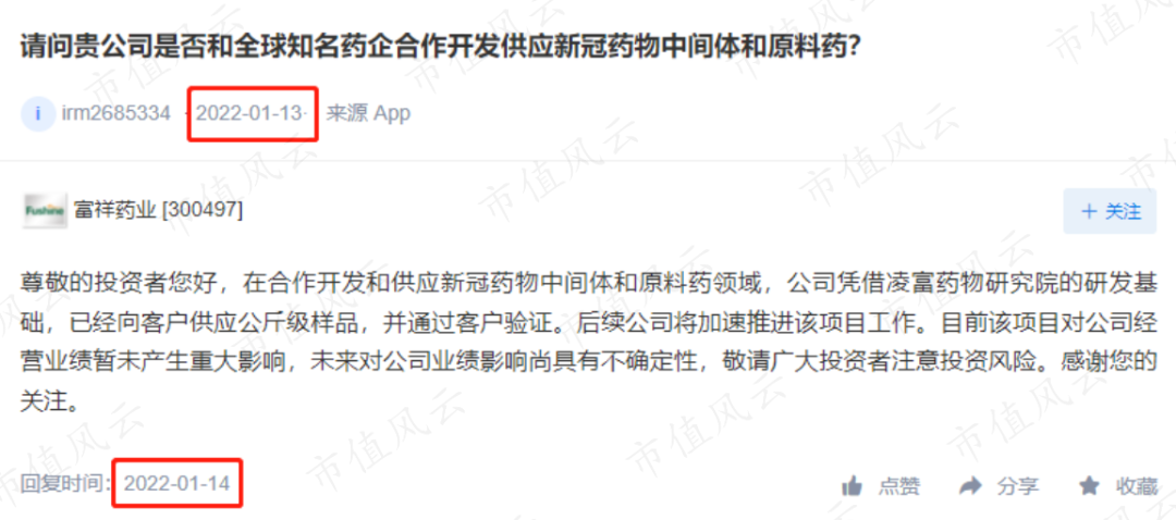 1月13日当天,还有投资人在主动在互动易平台询(双)问(簧)富祥药业,是否和全球知名药企合作开发供应新冠药物中间体和原料药。