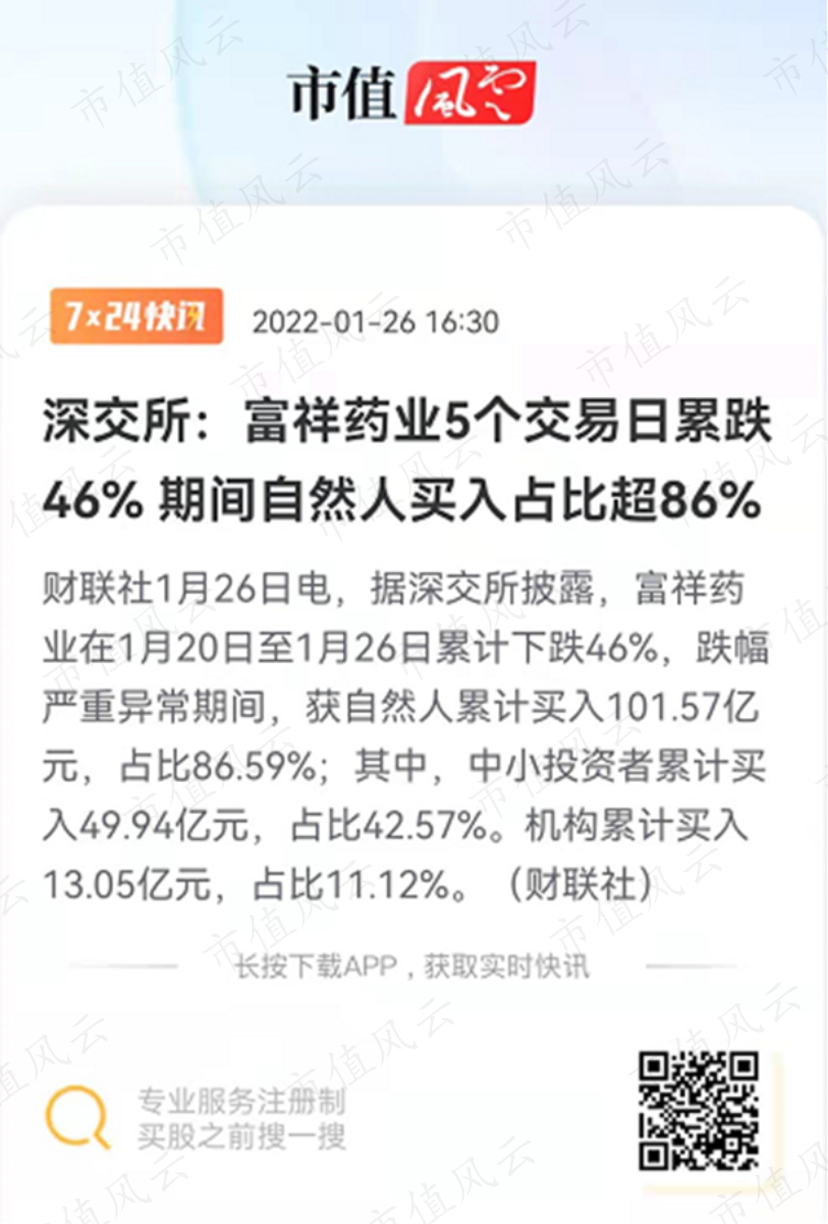 受此消息影响,虽然富祥药业1月20日仍以涨停开盘,但随即被天量资金砸开,随后各路资金夺命出逃,最终大跌7.31%,全天成交金额更是高达50亿元。而富祥药业1月27日收盘时的市值不过70亿出头。