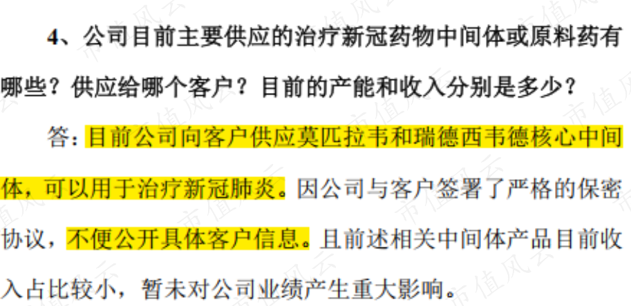 然而在富祥药业1月19日晚间披露的投资机构电话会议调研记录中,富祥药业先是承认公司相关中间体确实可以用于治疗新冠肺炎,但是以保密为由,没有披露具体客户信息。