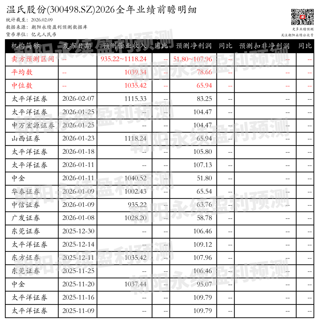 截至2026年02月09日,根据朝阳永续季度业绩前瞻数据: