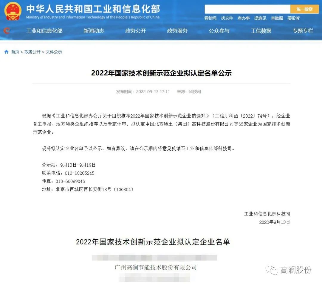 近日,国家工业和信息化部发布《2022年国家技术创新示范企业拟认定名单公示》。据公告显示,全国共有65家企业入选,广州高澜节能技术股份有限公司荣登榜单。