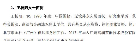 梁清利离职后,其董秘和财务总监职务分别由王杨阳和黄光明接任。值得注意的是,新董秘王杨阳没有任何上市公司董秘经验,1990 年生,曾于北京市金杜(广州)律师事务所工作。2017 年加入高澜股份任法务专员,现任证券法务事务部副经理。