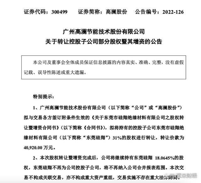 【紫米财经文/蒋春晓】11月7日,近日,高澜股份(300499)发布公告称,拟拟将持有的控股子公司东莞市硅翔绝缘材料有限公司31%的股权进行转让,转让价款为40920.00万元。