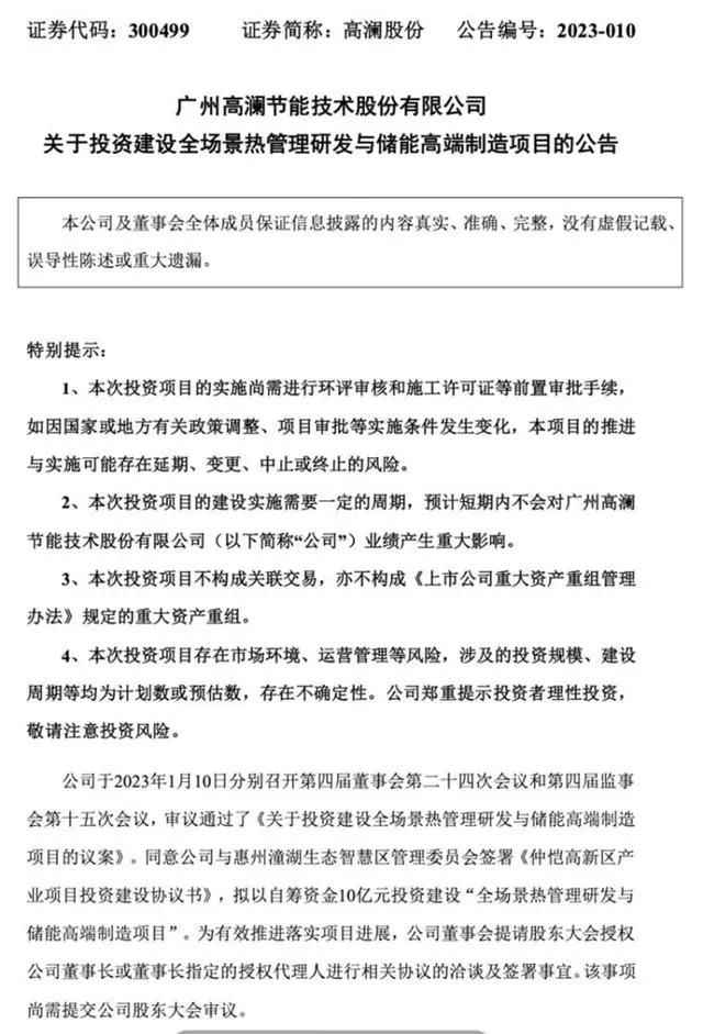 在定增预案披露的同一天,高澜股份还抛出了一份大额投资项目公告。