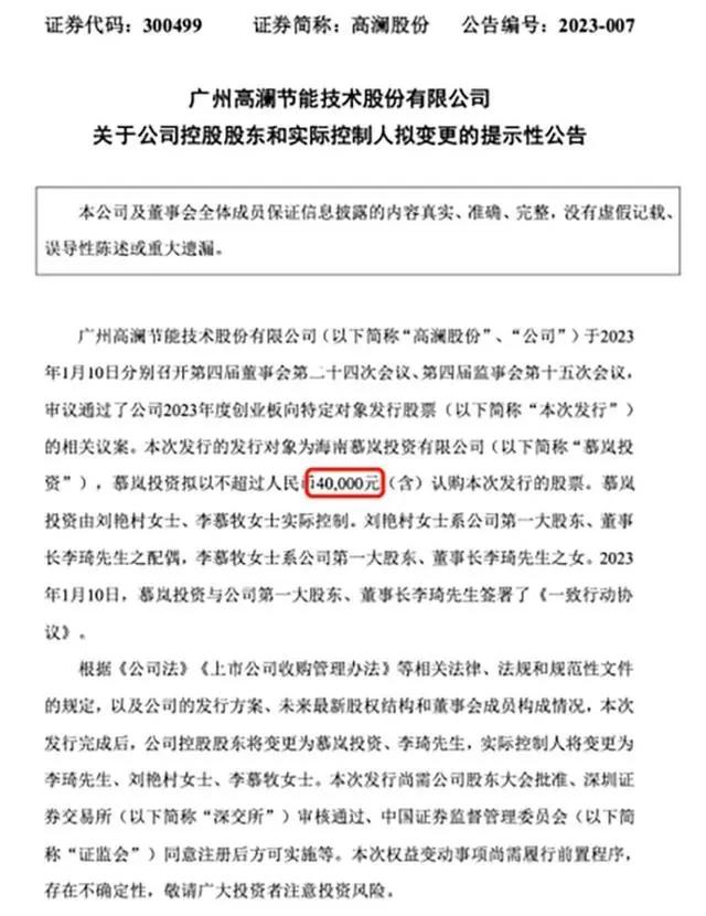 “00后”将要成为上市公司高澜股份实控人之一?1月13日晚间,因“董事长妻女定增入股”而引起市场关注的高澜股份,发布了最新回复公告。