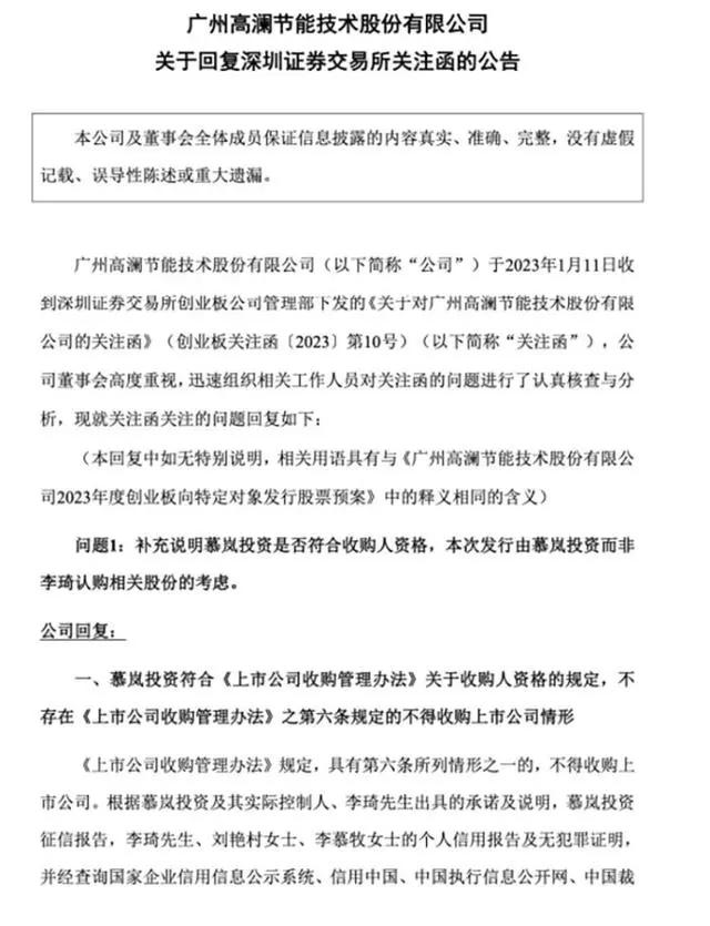 在1月13日的回复中,高澜股份表示,根据慕岚投资及其实际控制人、李琦出具的承诺及说明等资料,慕岚投资符合收购人资格。