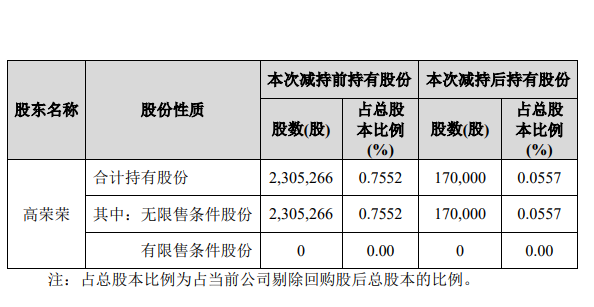 2023年4月12日~4月21日,高荣荣在尚未披露减持意向的情况下,通过集中竞价方式卖出上市公司股票合计213.53万股,成交金额约3396.62万元。本次股份减持后,高荣荣持有上市公司股份17万股,占总股本比例为0.0557%。
