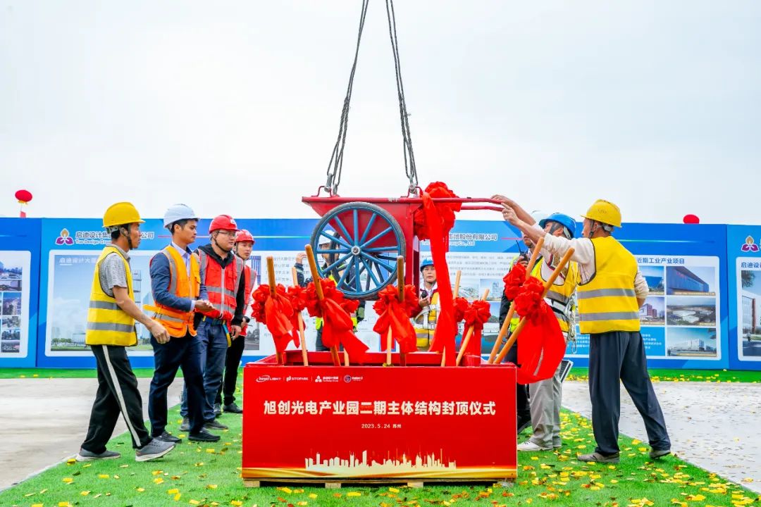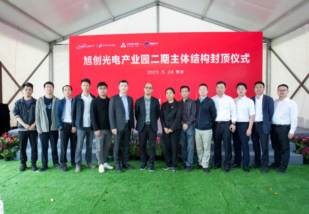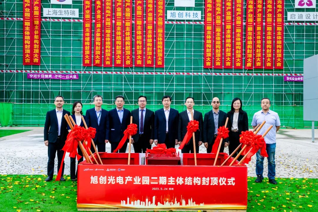 5月24日上午,启迪设计集团工程总承包项目——苏州旭创光电产业园二期封顶仪式隆重举行。苏州工业园区高端制造与国际贸易区党工委书记刘广立、苏州市工信局副局长万资平、苏州工业园区高端制造与国际贸易区党工委副书记虞吉强、苏州工业园区经济发展委员会副主任丁芳、苏州工业园区科技招商中心副主任王建华、苏州工业园区科技发展有限公司副总经理朱利锋、苏州旭创科技有限公司总经理刘圣、旭创光电产业园总经理丁海等出席,启迪设计集团总裁查金荣应邀致辞,集团副总裁袁雪芬,总裁助理、工程管理部总经理苏鹏及科技产业研究中心、工程管理团队应邀参加仪式。
