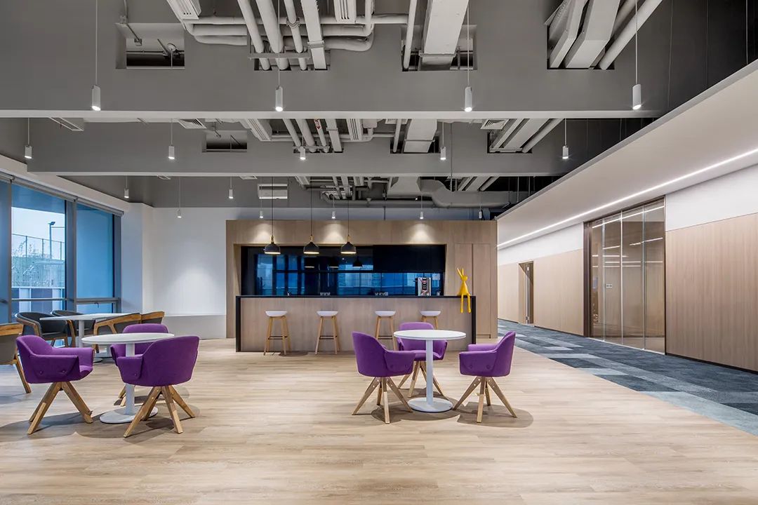 水吧区布置得温馨舒适,紫色的椅子整齐排列,吧台位于休息区的中心位置,各种酒水饮料和装饰品为休息区增添了一份现代感。整个休息区光线柔和,氛围舒适,是一个人们可以在这里放松身心、交流想法的好区域。