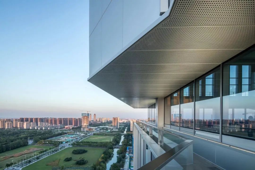 大厦塔楼每四层创造一个垂直院落,仿佛是苏州民居中一进进的院落在垂直方向上的现代演绎;每四层一圈外廊形成空中环廊,宛如苏州园林中的“廊”,将人与自然完美融合。