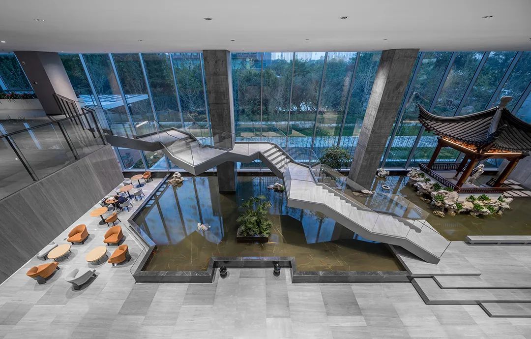大堂楼梯的每一个台阶都仿佛是园林中的一处景致,让来访者在来去楼梯的过程中,仿佛置身于苏州园林之中,感受那份宁静与雅致。