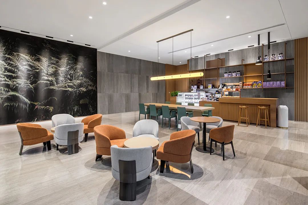 咖啡吧则以简约大气为主调,通过精巧的布局和装饰,营造出一种宽敞明亮、舒适宜人的氛围。高级大理石铺设的地面质感温润且易于清洁,舒适的沙发、精美的茶几,为来访者提供贴心的服务。
